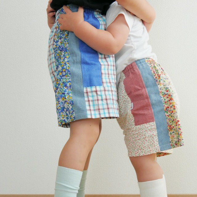 4素材のコットン生地を合わせたパッチワークハーフパンツです。 サラッとした薄手の綿素材と、デニム生地をはぎ合わせていて、 古着チックなデザインにしました♪ 兄妹お揃いで着せても可愛いです♪ ※記載にないサイズをご希望の方は、お気軽にご相談くださいませ。 【カラー】 Red Blue 【サイズ】 80cm 90cm 100cm 110cm 着用サイズ:90cm 110cm モデル:1歳10ヶ月(身長約79cm) 4歳5ヶ月(身長約105cm) 素材:綿100%