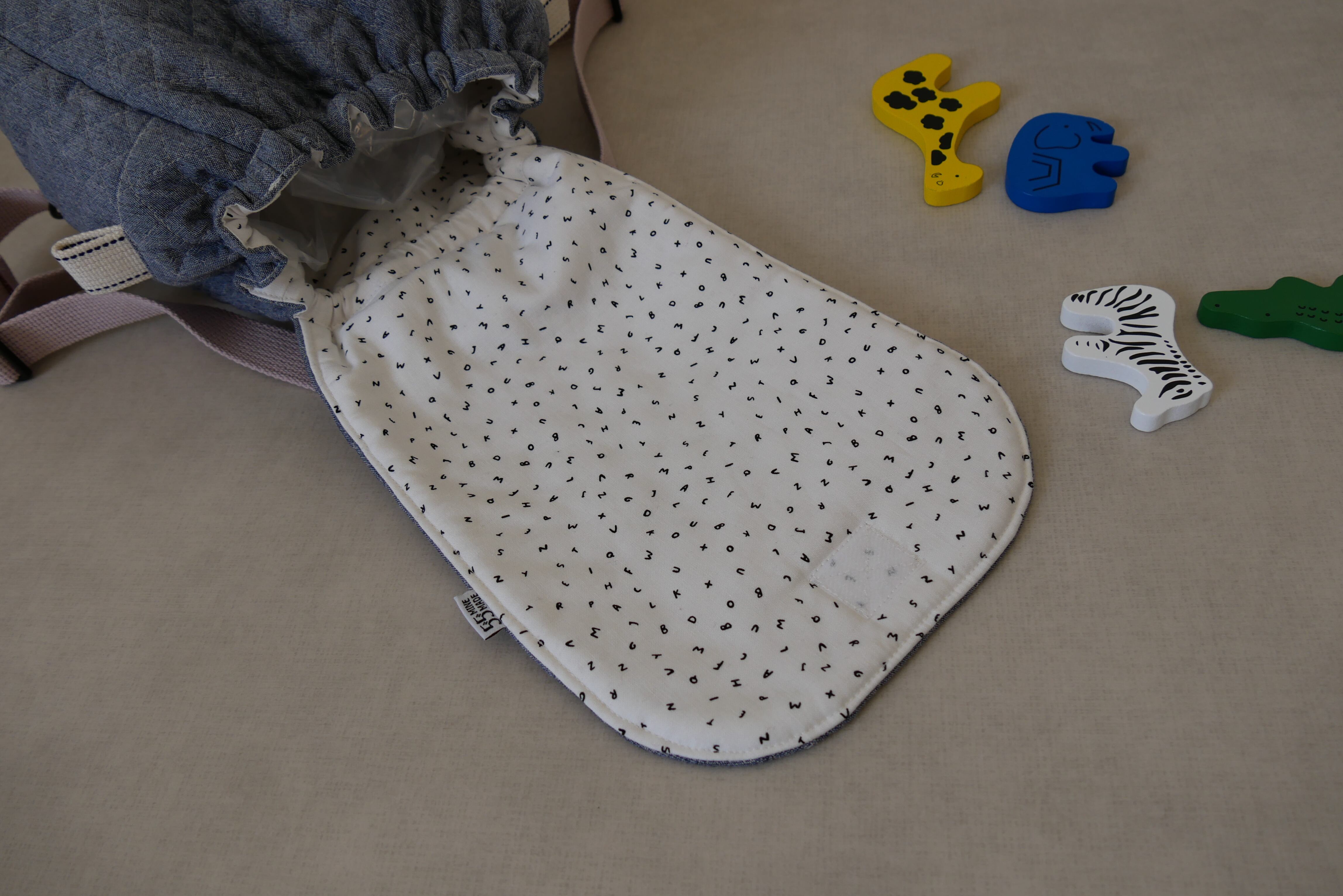 裏地は可愛らしいアルファベット柄のコットン生地を使用しています。