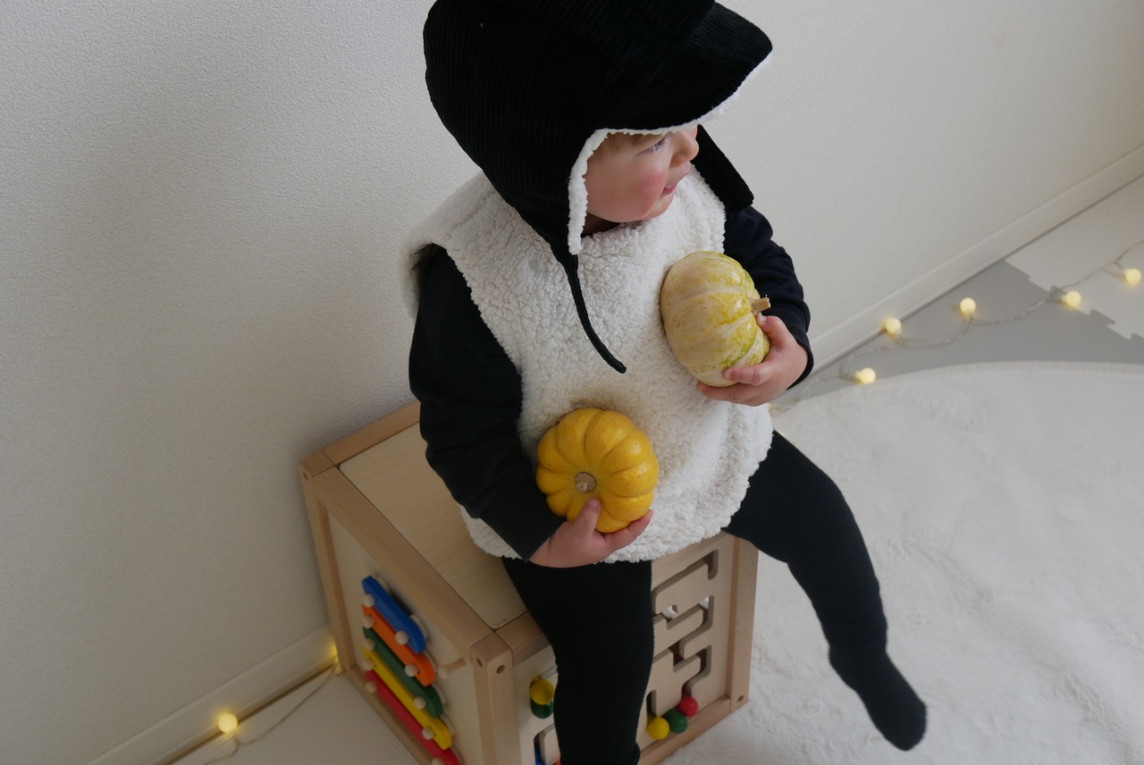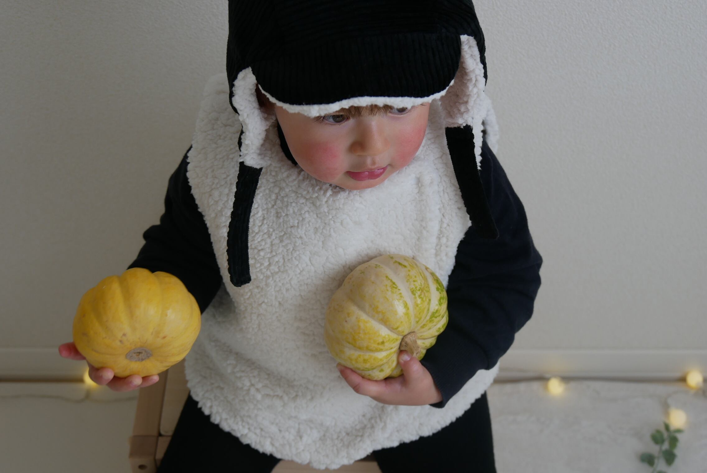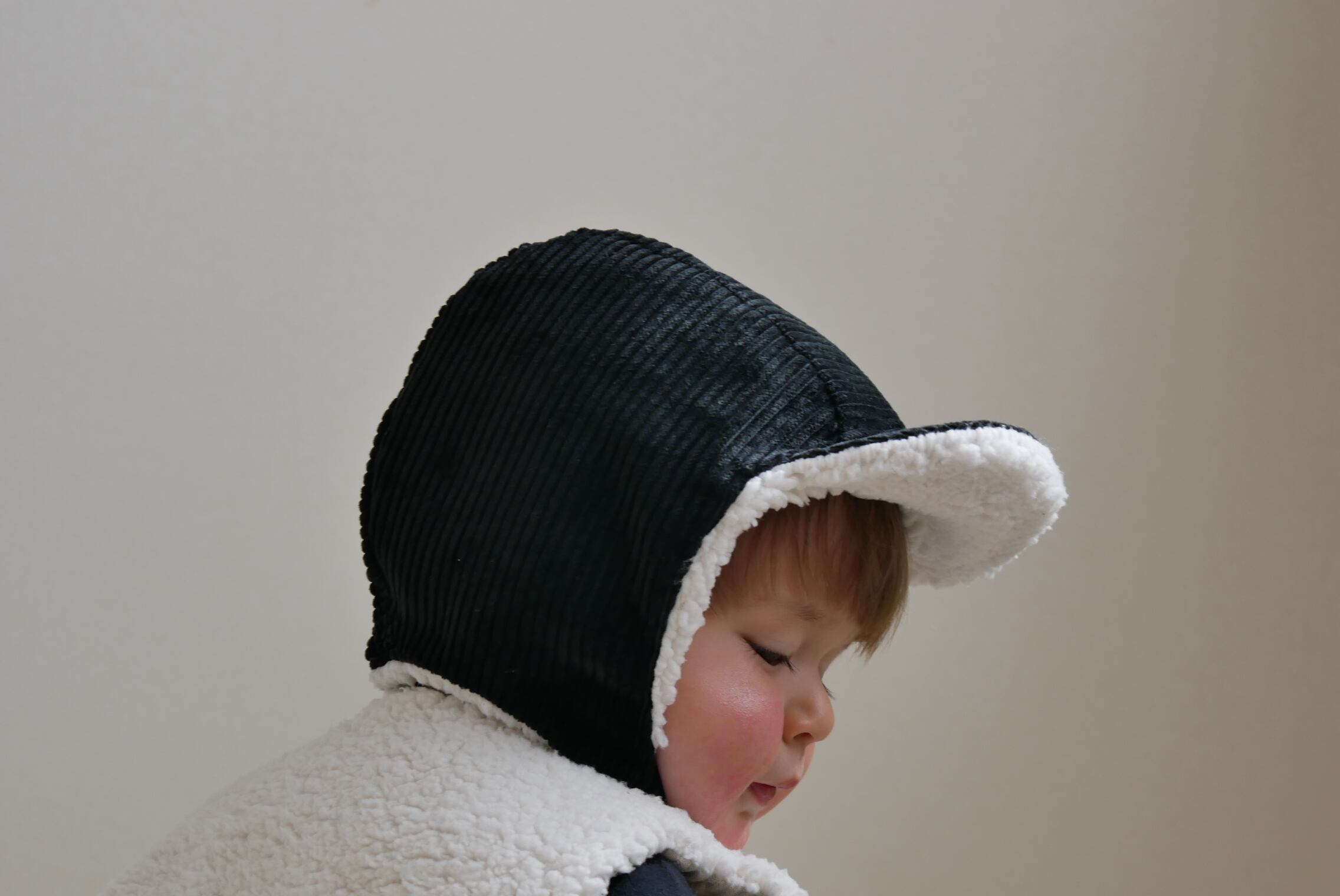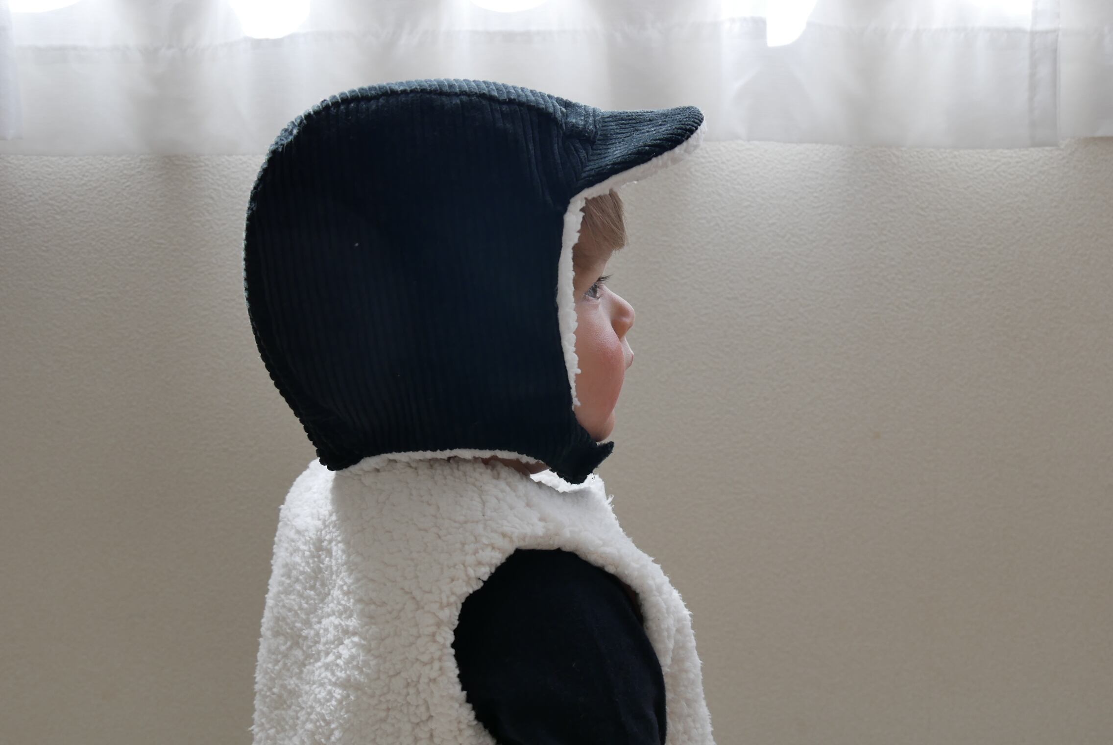 お子様の頭を優しくすっぽり包み込み、寒い季節にぴったりな帽子です。