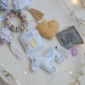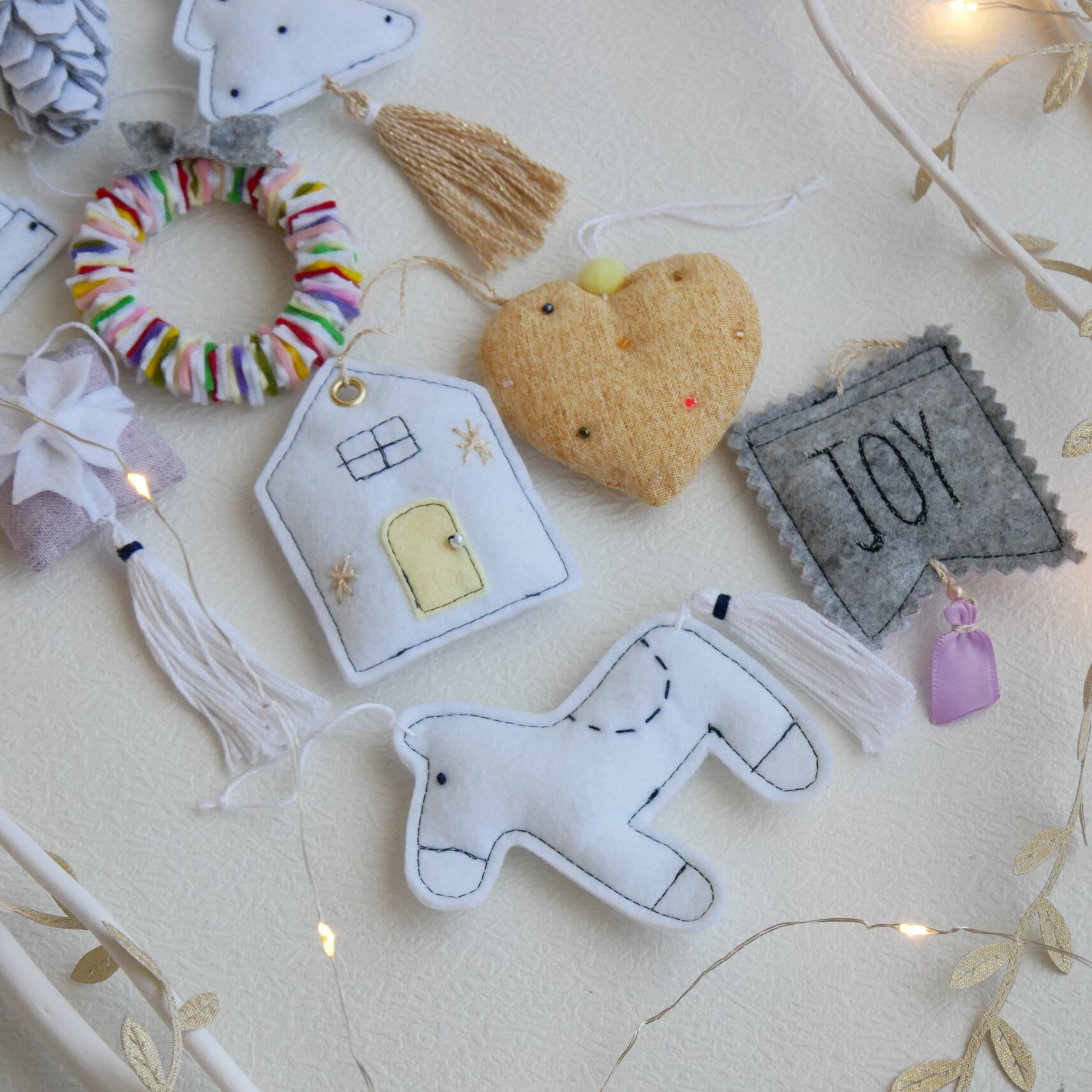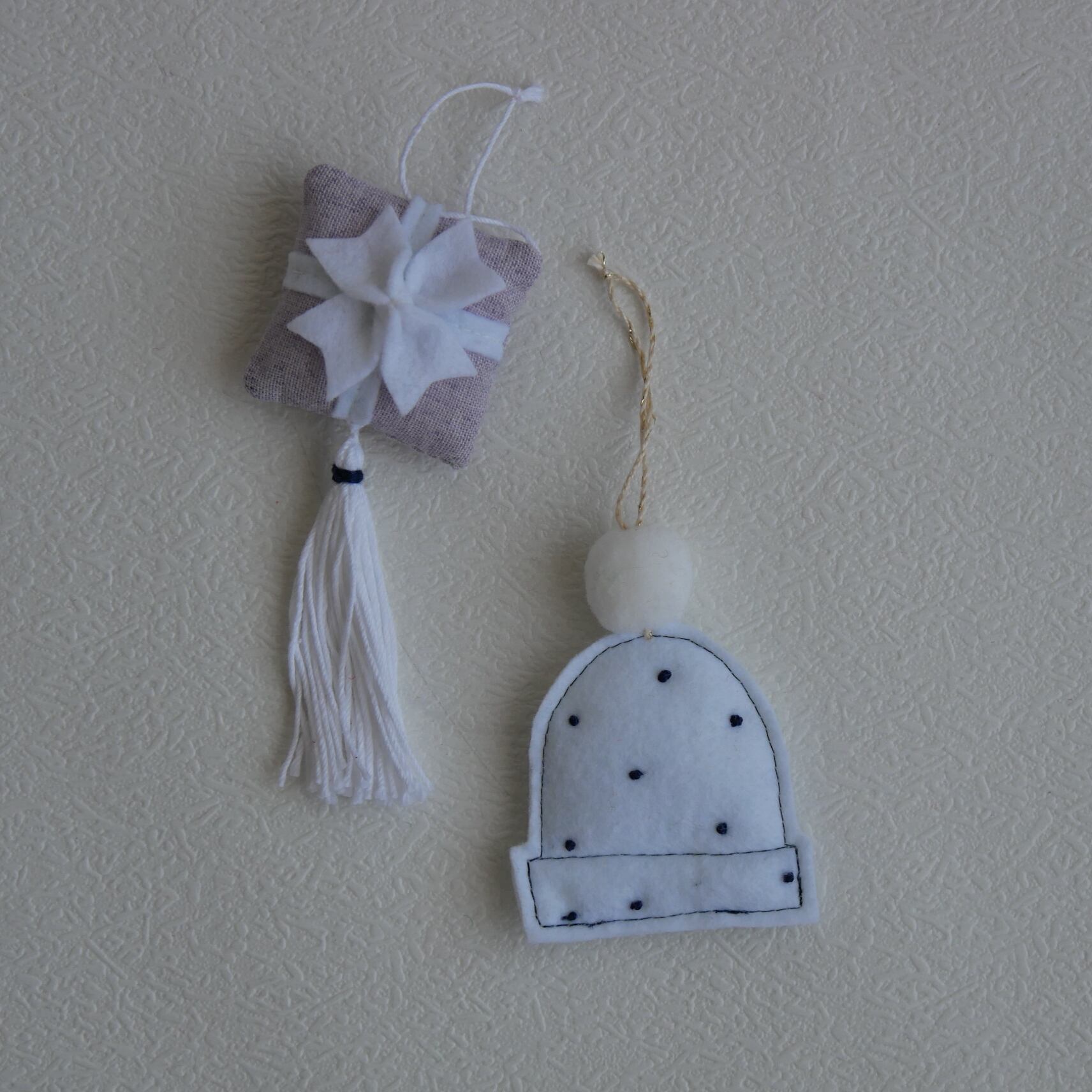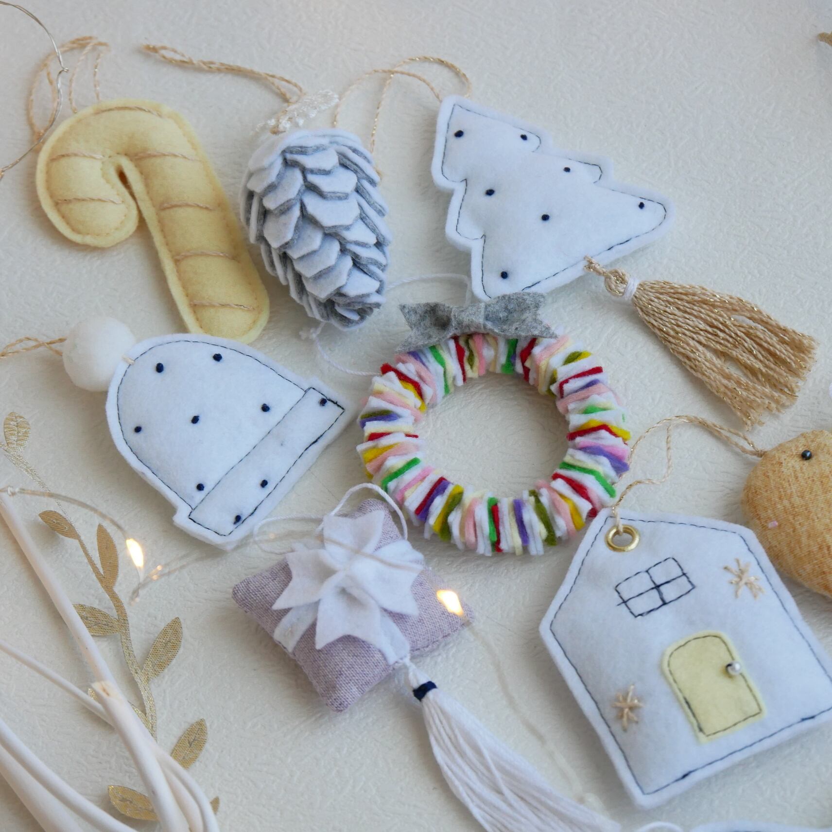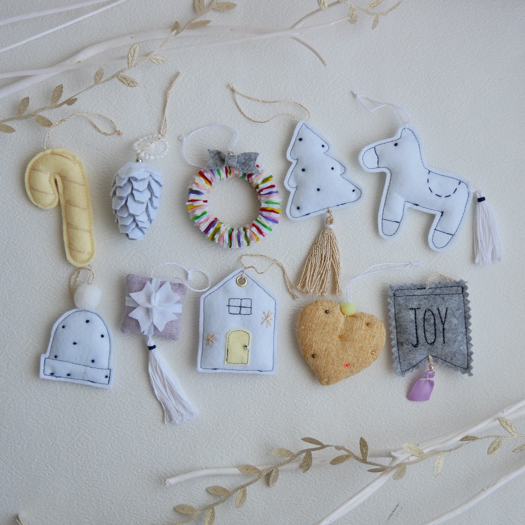 フェルトとコットン素材で作ったクリスマスオーナメント10点セットです。