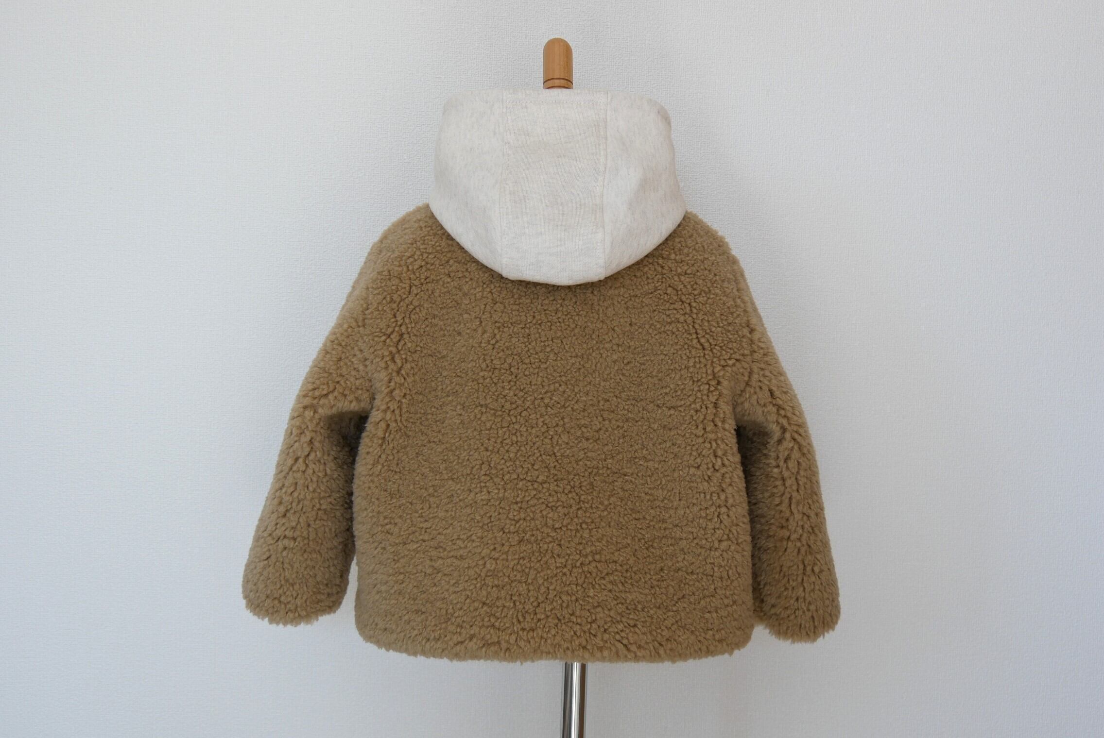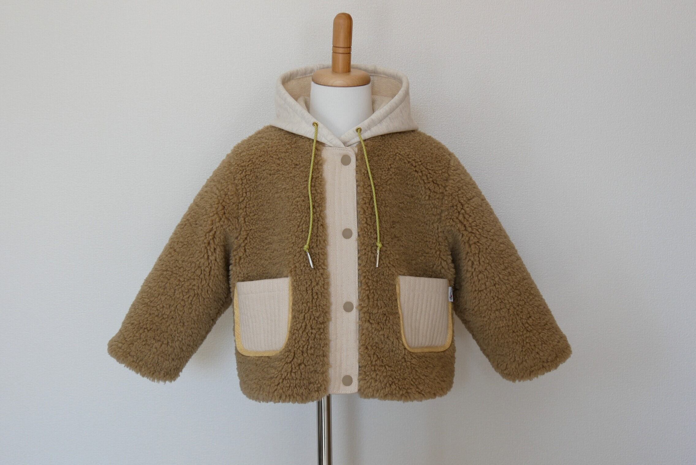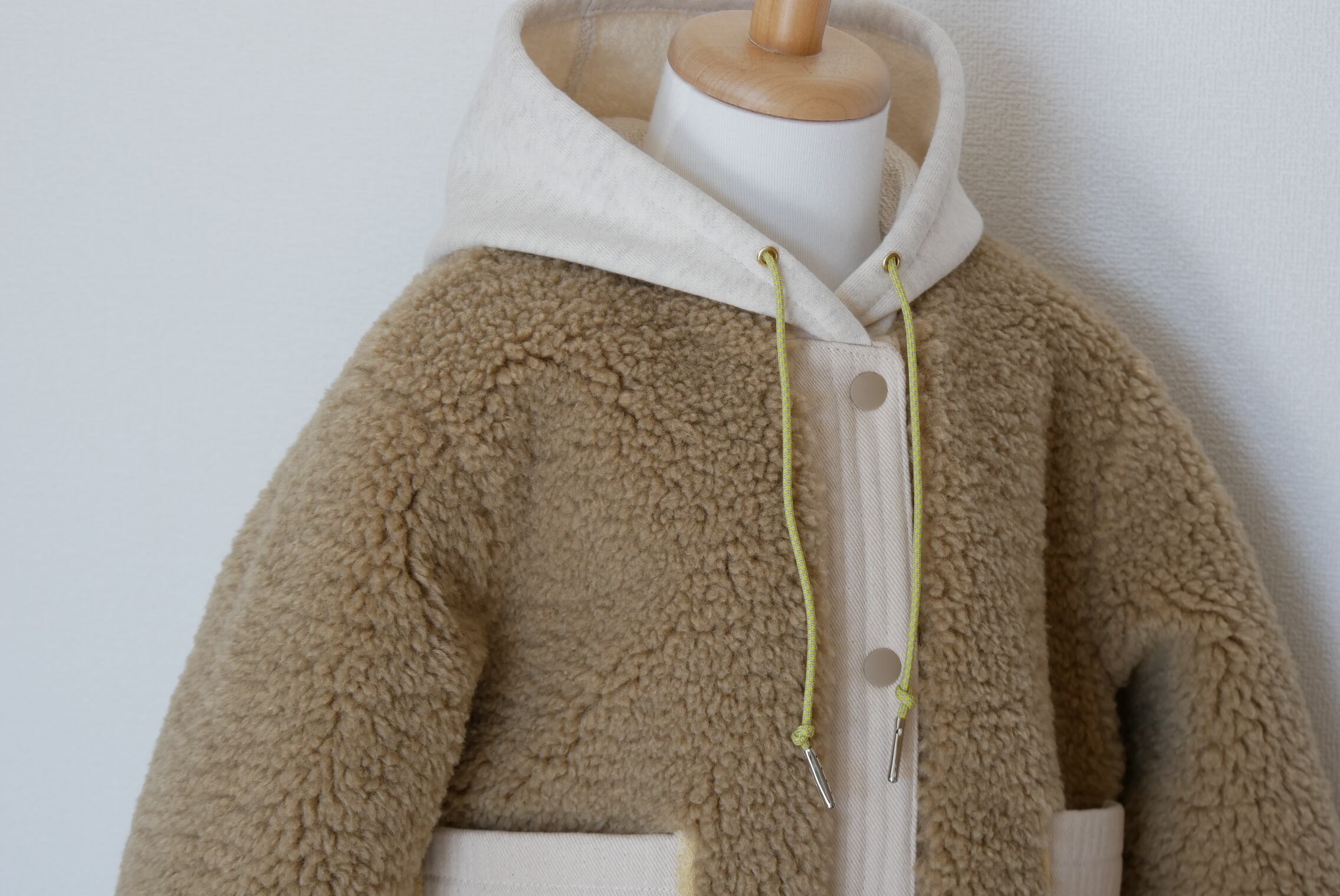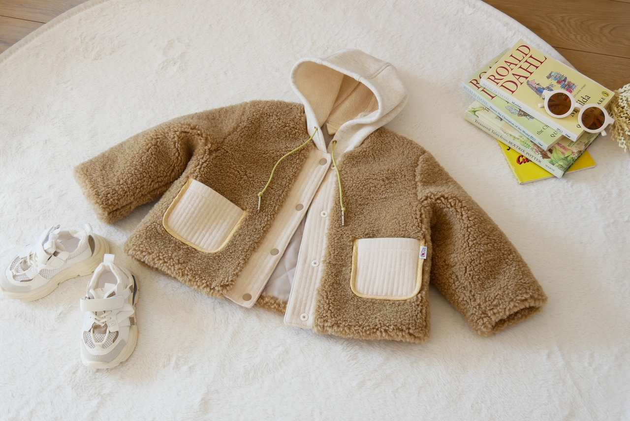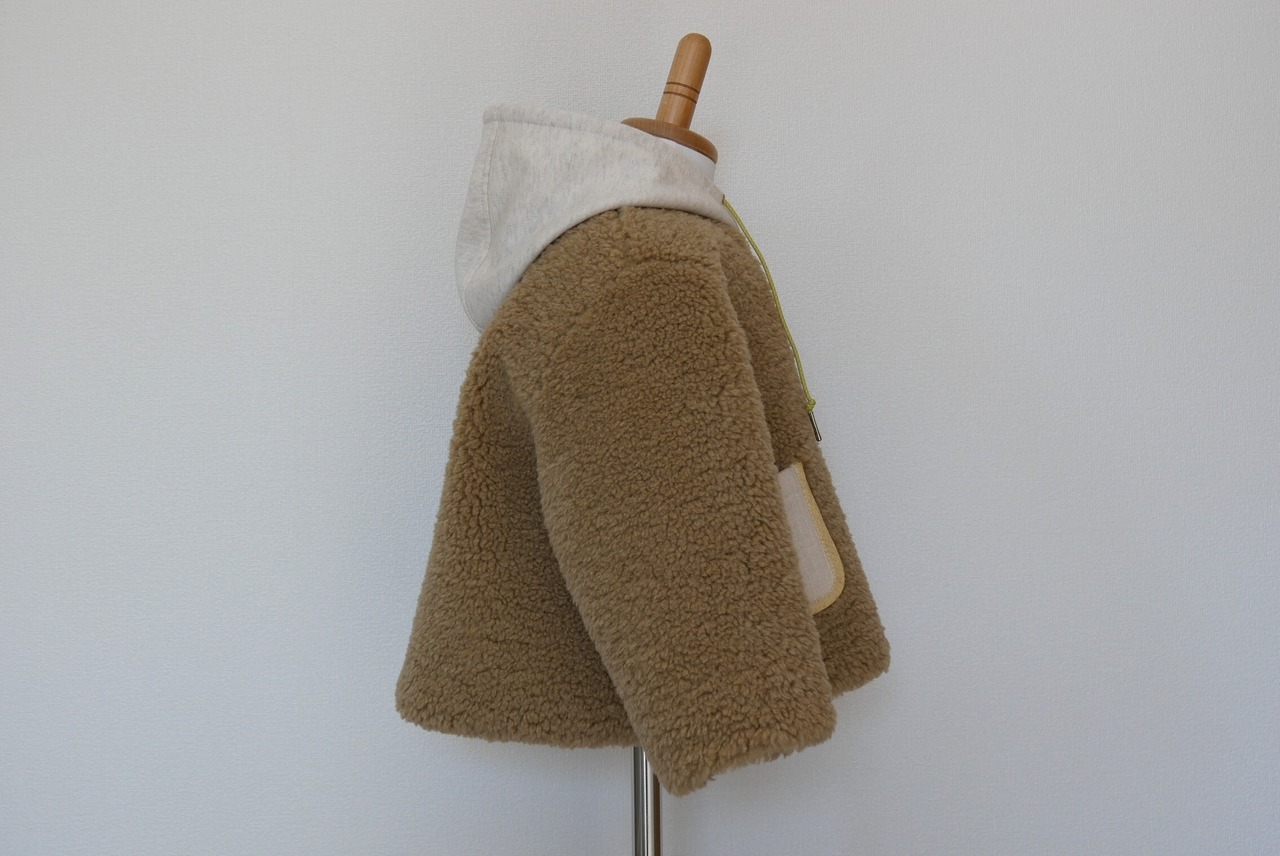 もこもこシープボアを使用したフード付き冬用コートです。