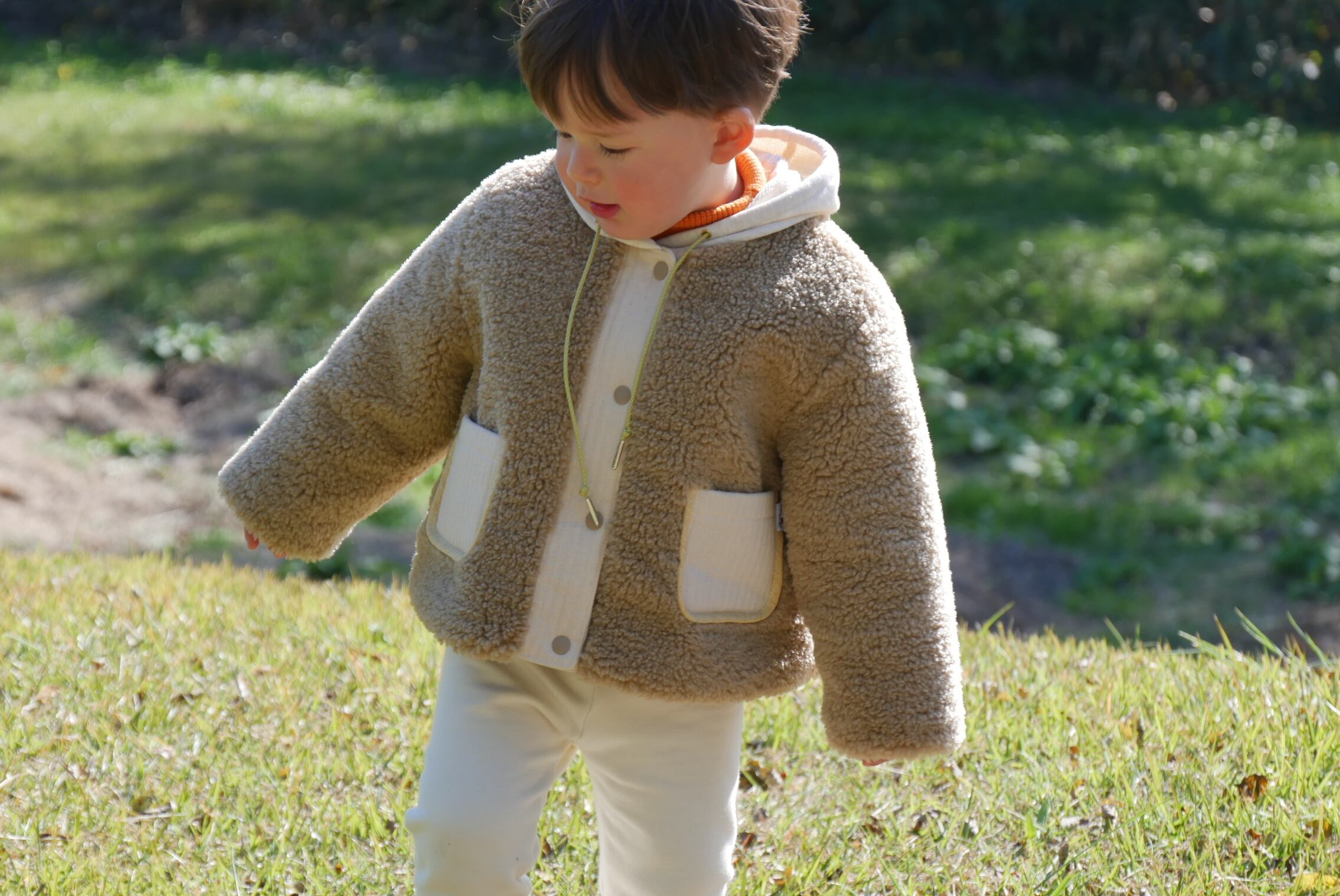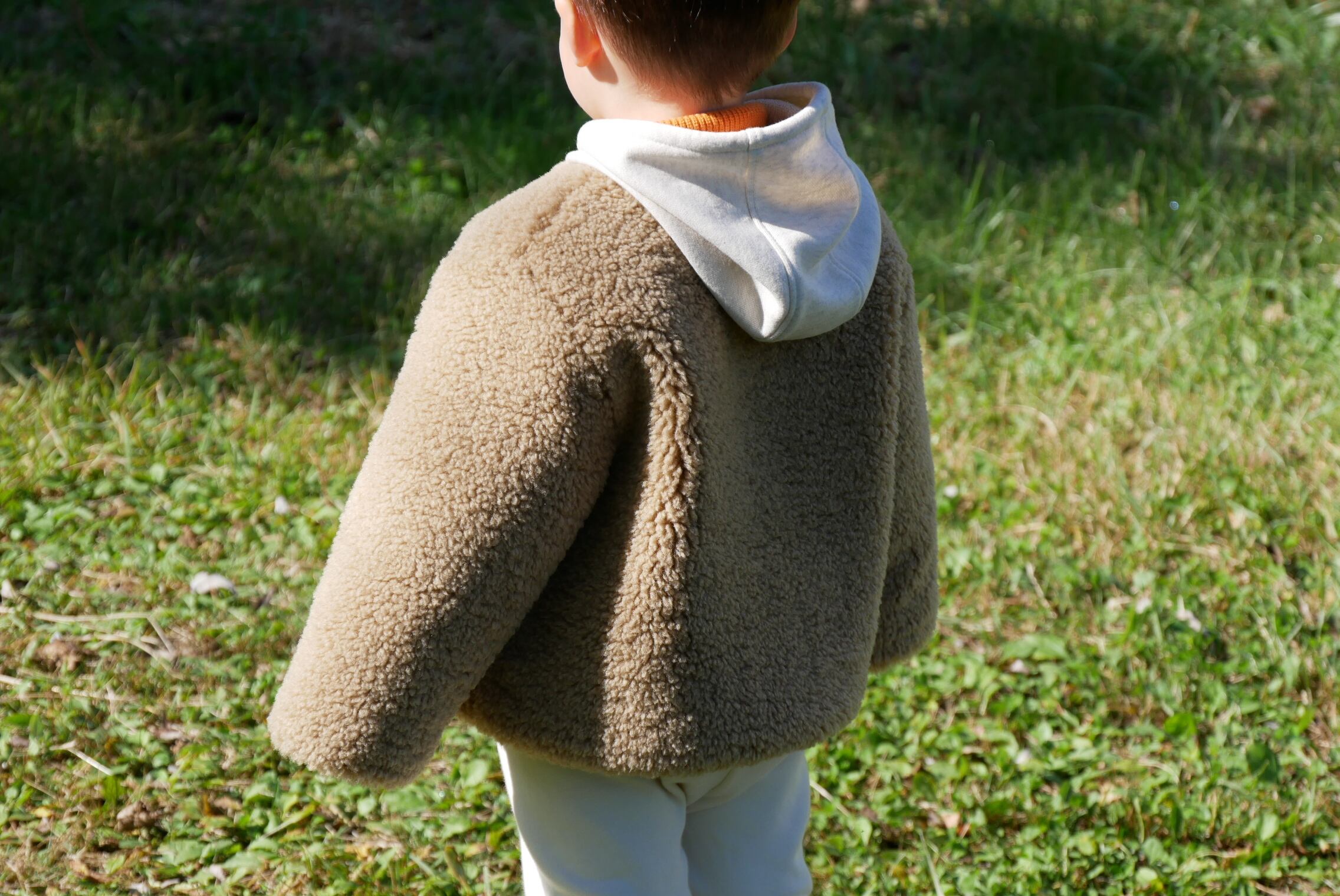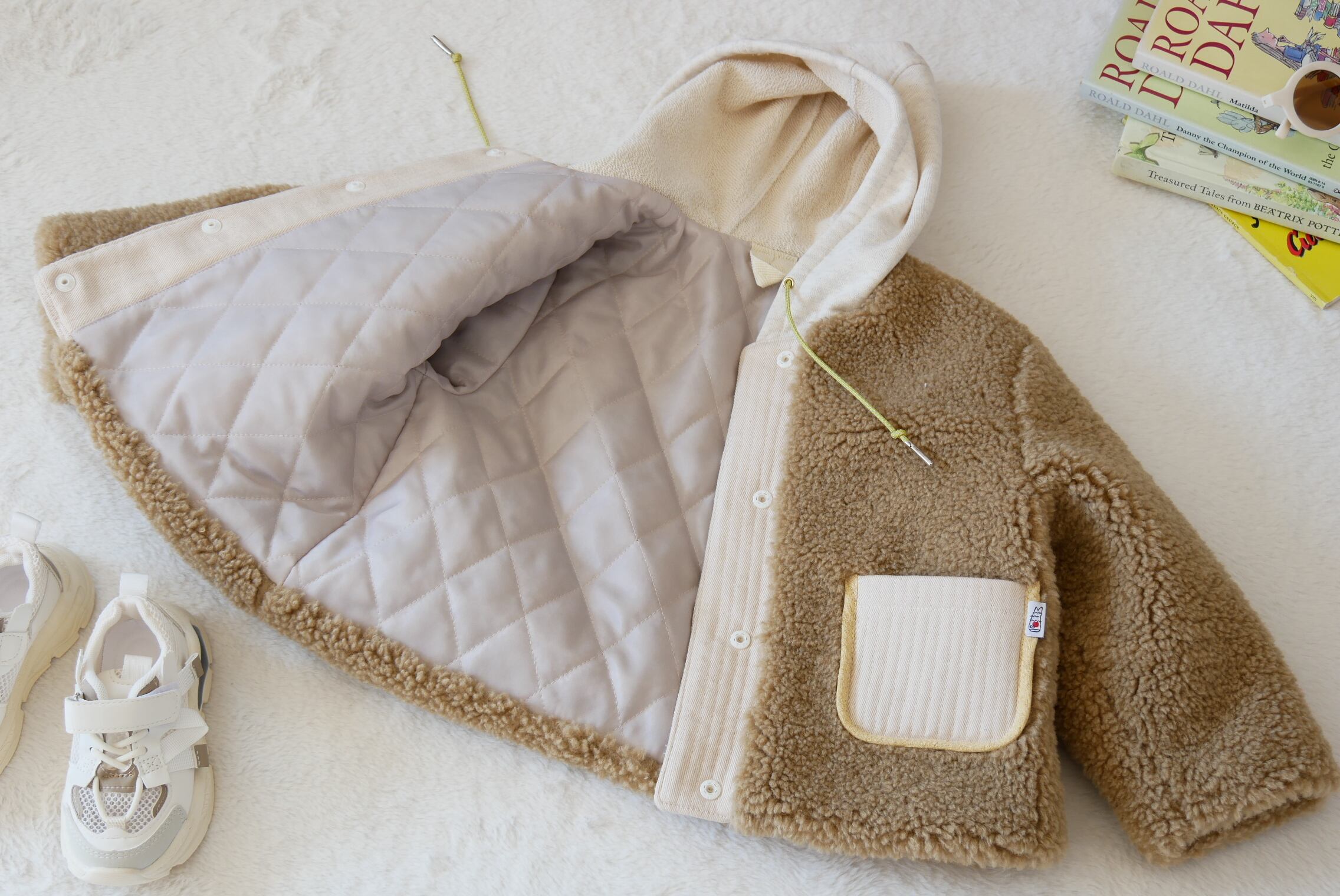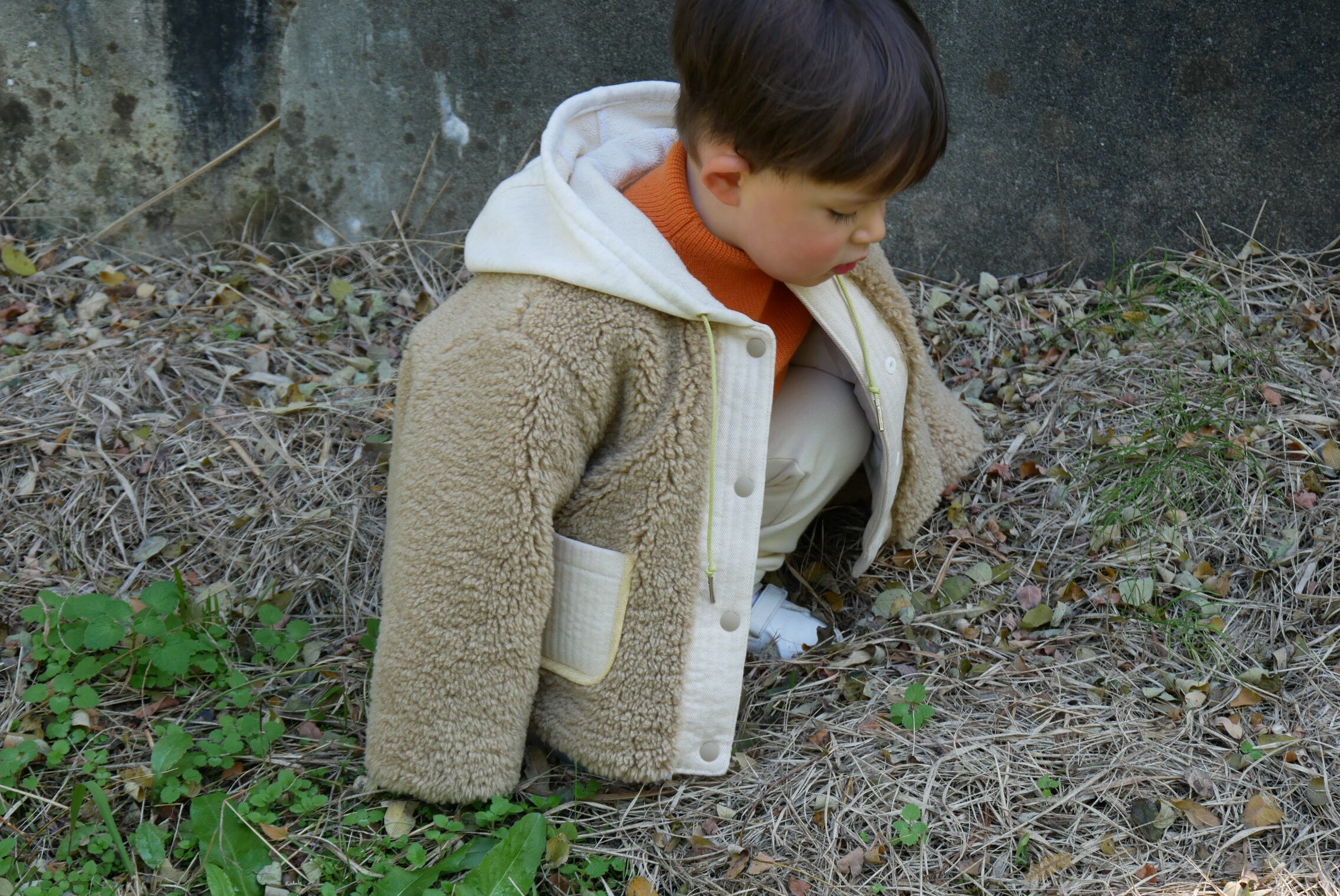 もこもこシープボアを使用したフード付き冬用コートです。