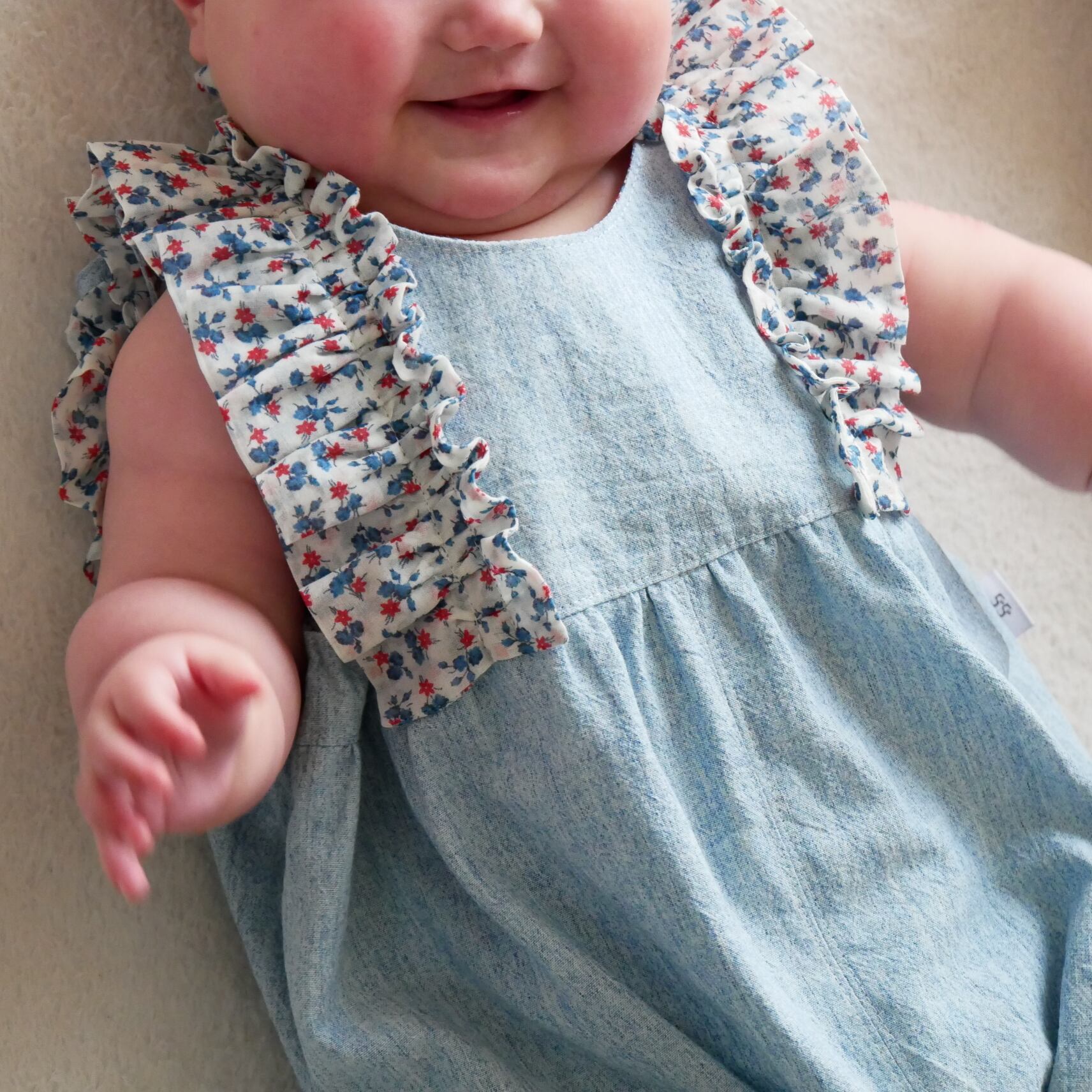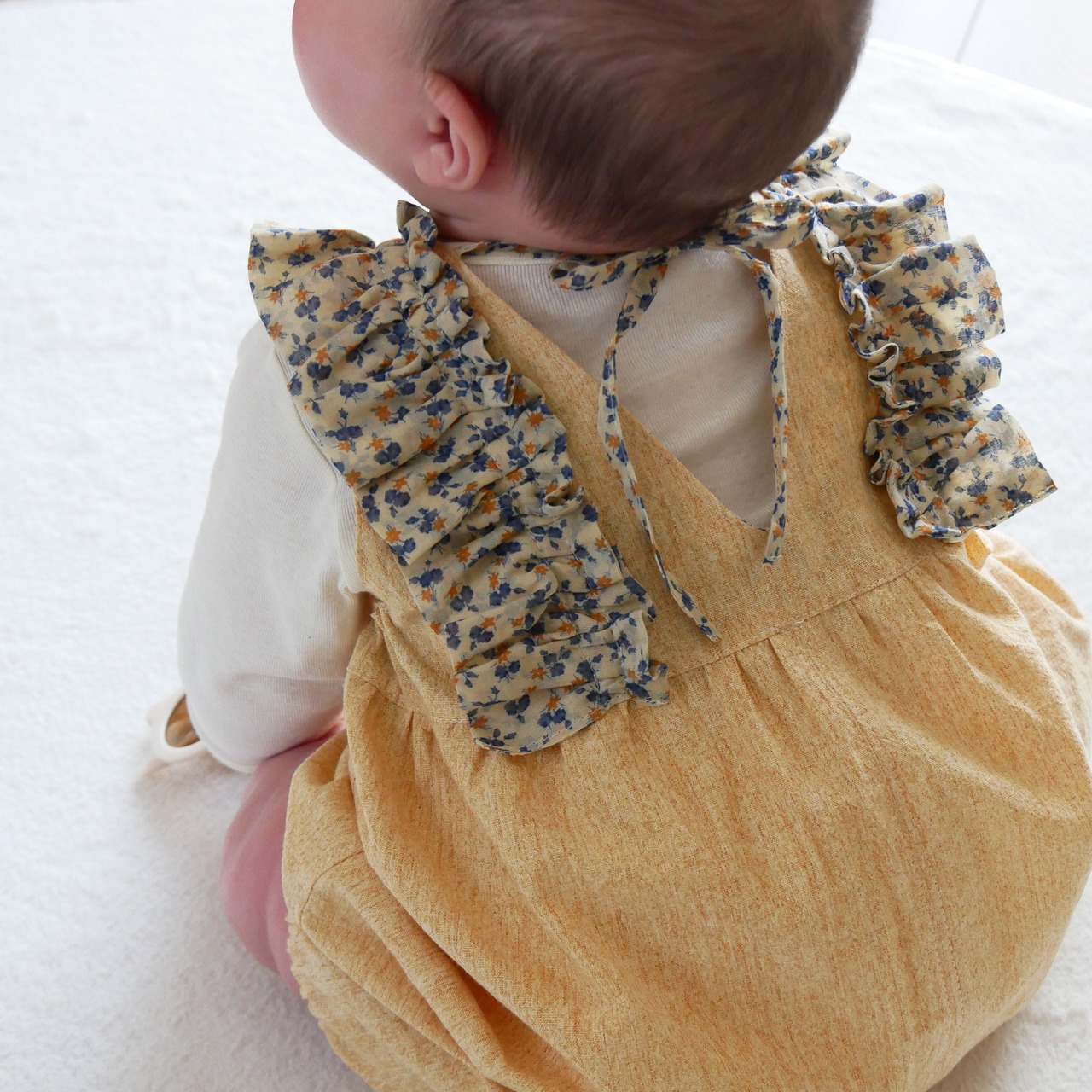 小花柄の可愛らしいフリルがふんだんに付いたロンパースです。