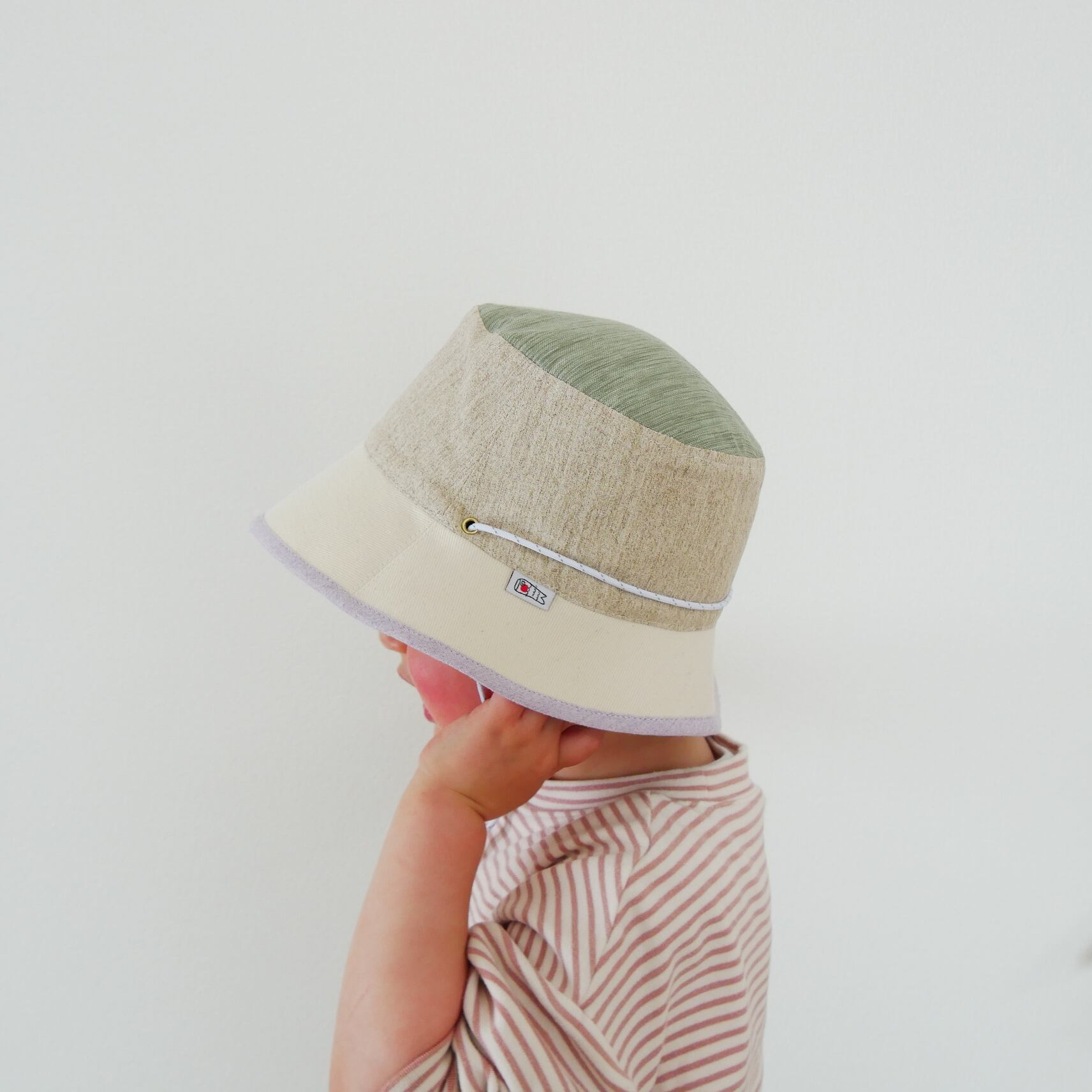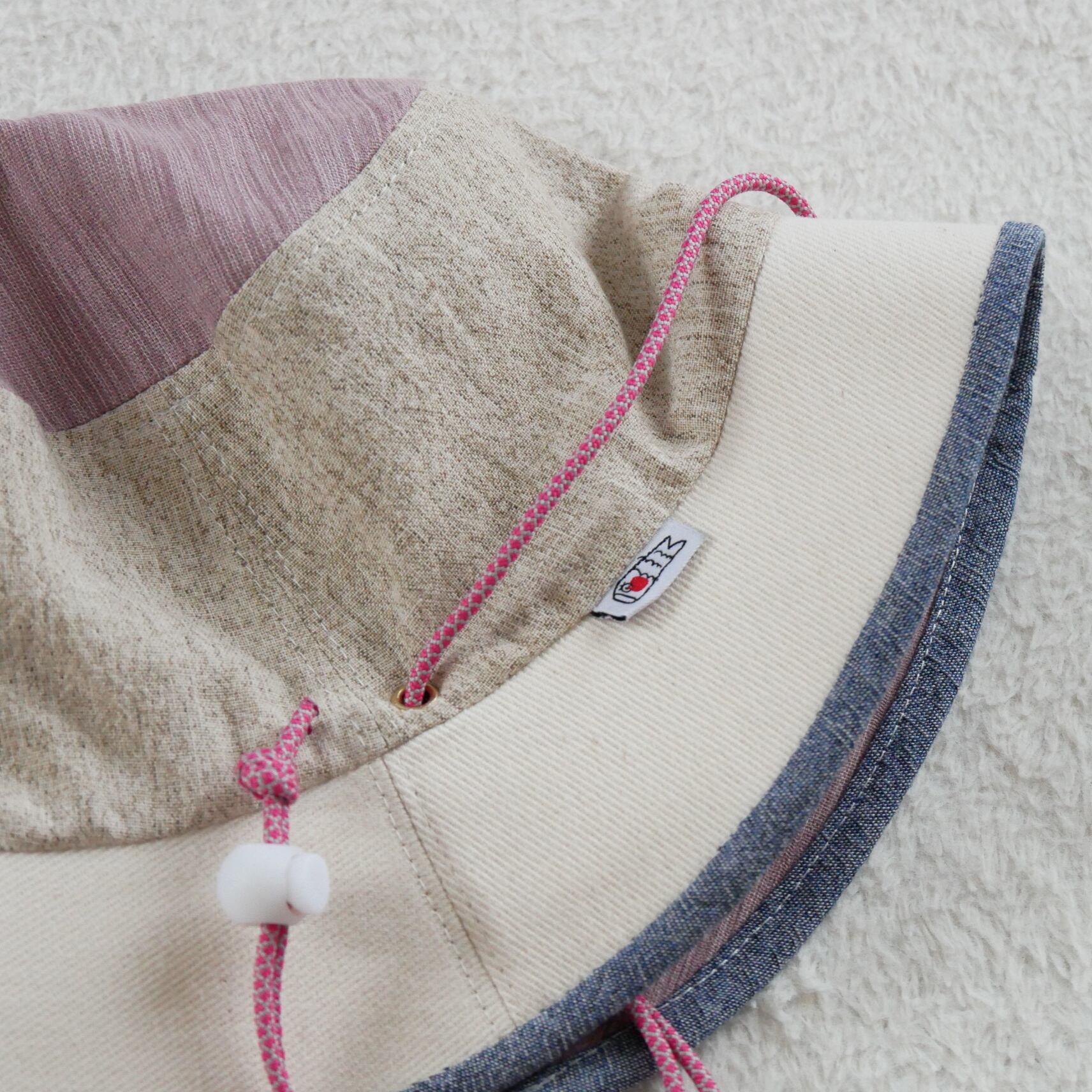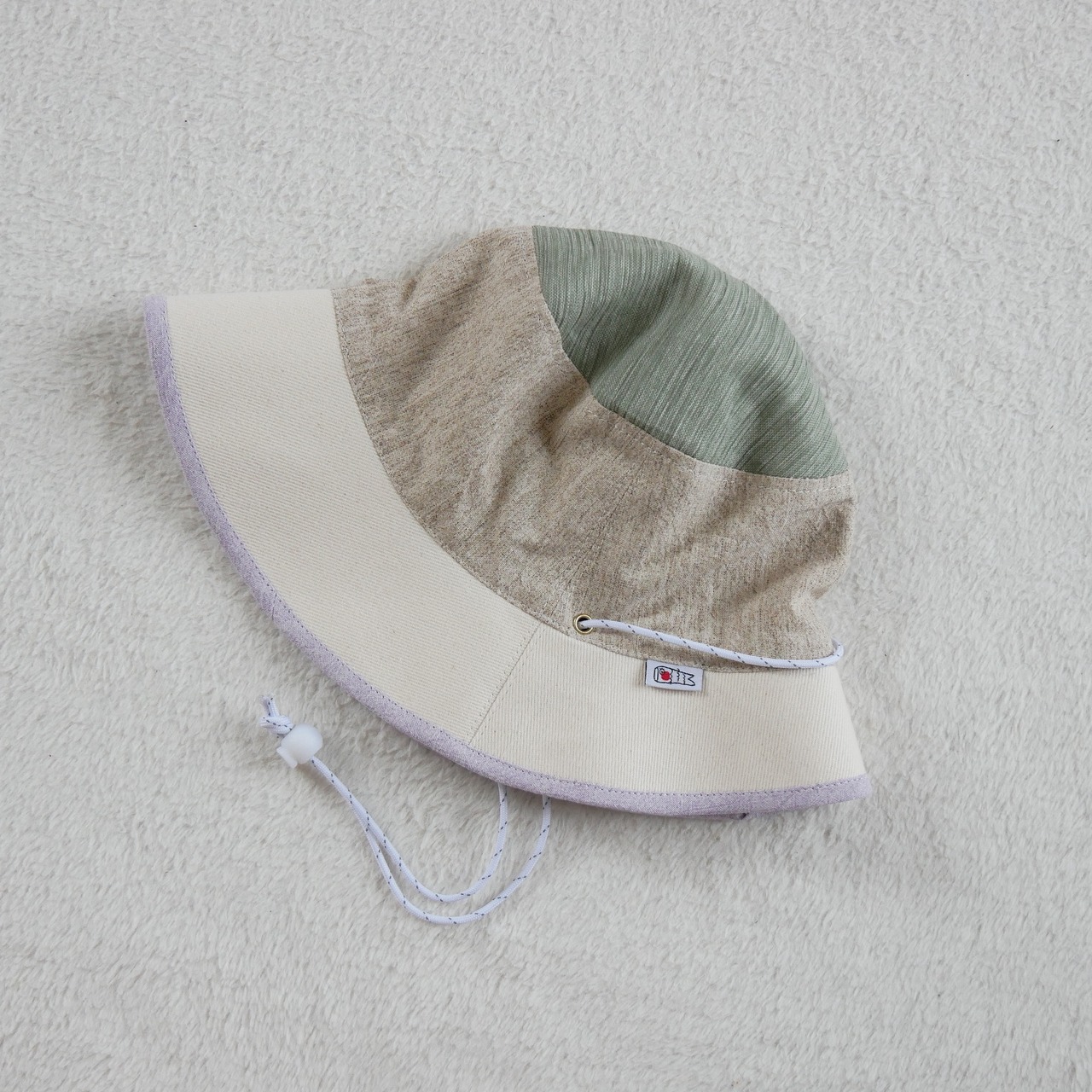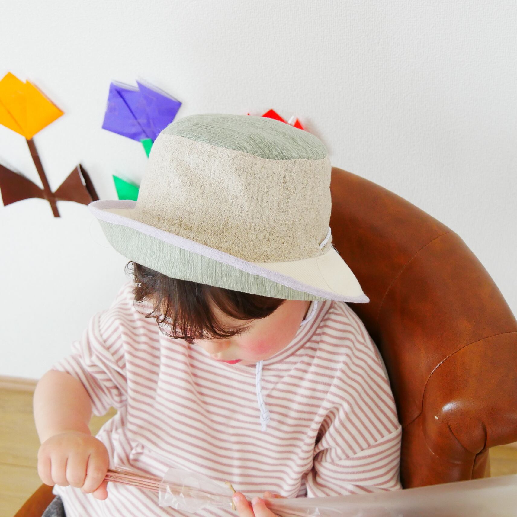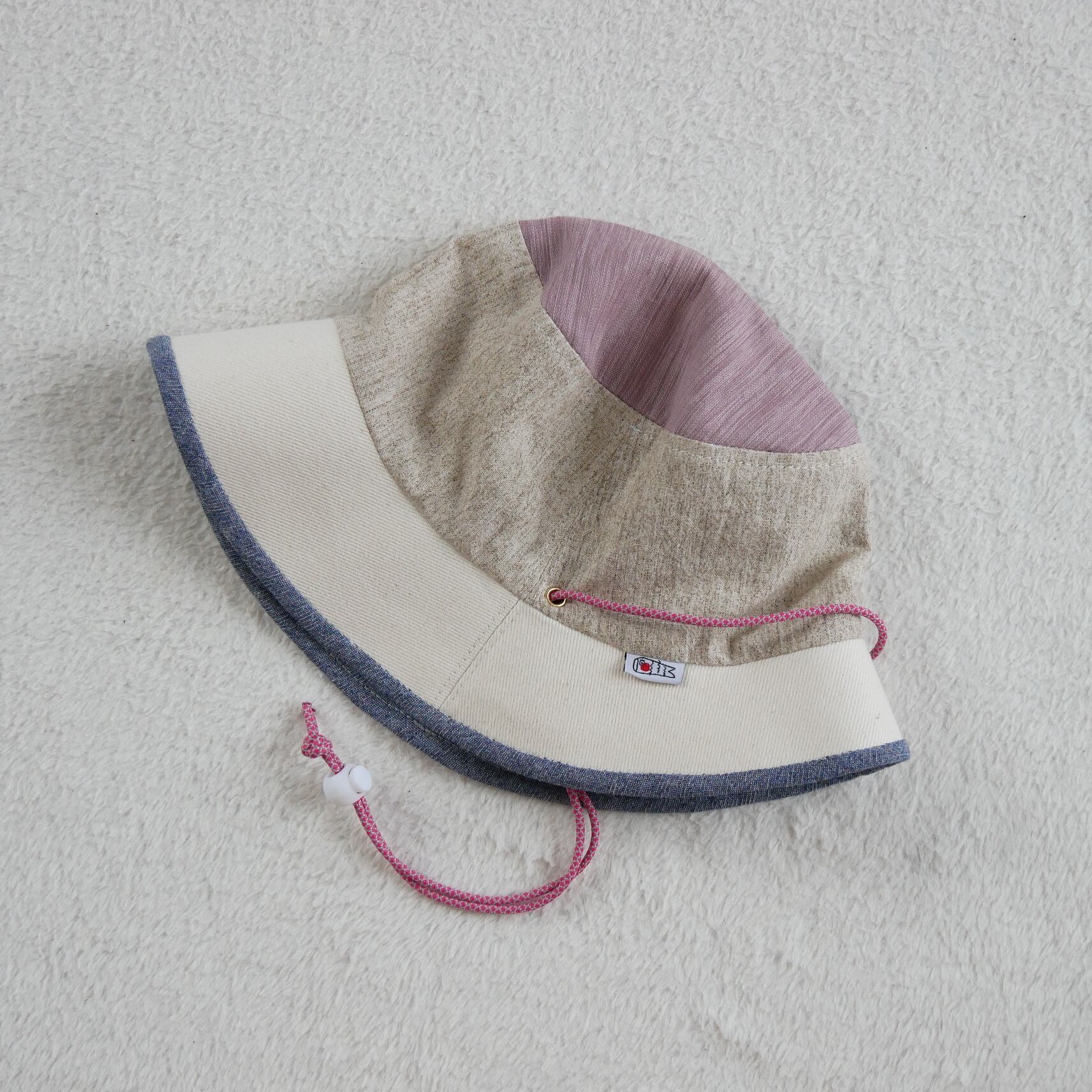 淡いパステル調の色合いと、つばのパイピングがアクセントになっていて、