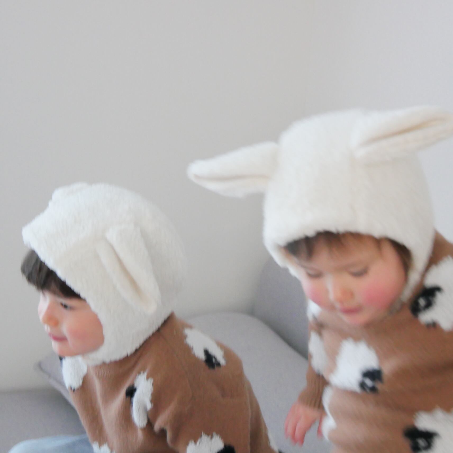 ちょっぴり大きめのひつじ耳がポイントで、お耳を持ちあげるとウサギさんにも変身♪